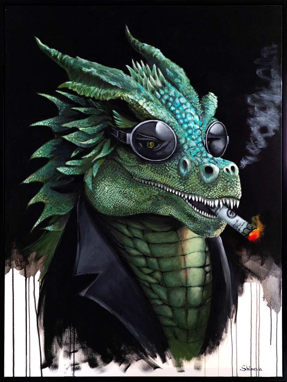 What distinguishes the series is its internal coherence. Earlier phases of Shimova’s work moved through a brighter, more pop-oriented palette, while New Totems developed a more controlled visual language built around dark grounds, gold accents, theatrical surface, and psychological charge. In these paintings, animals do not function as simple metaphors. They operate more like contemporary totems – figures that gather projection, identity, aspiration, and unease into a single image.