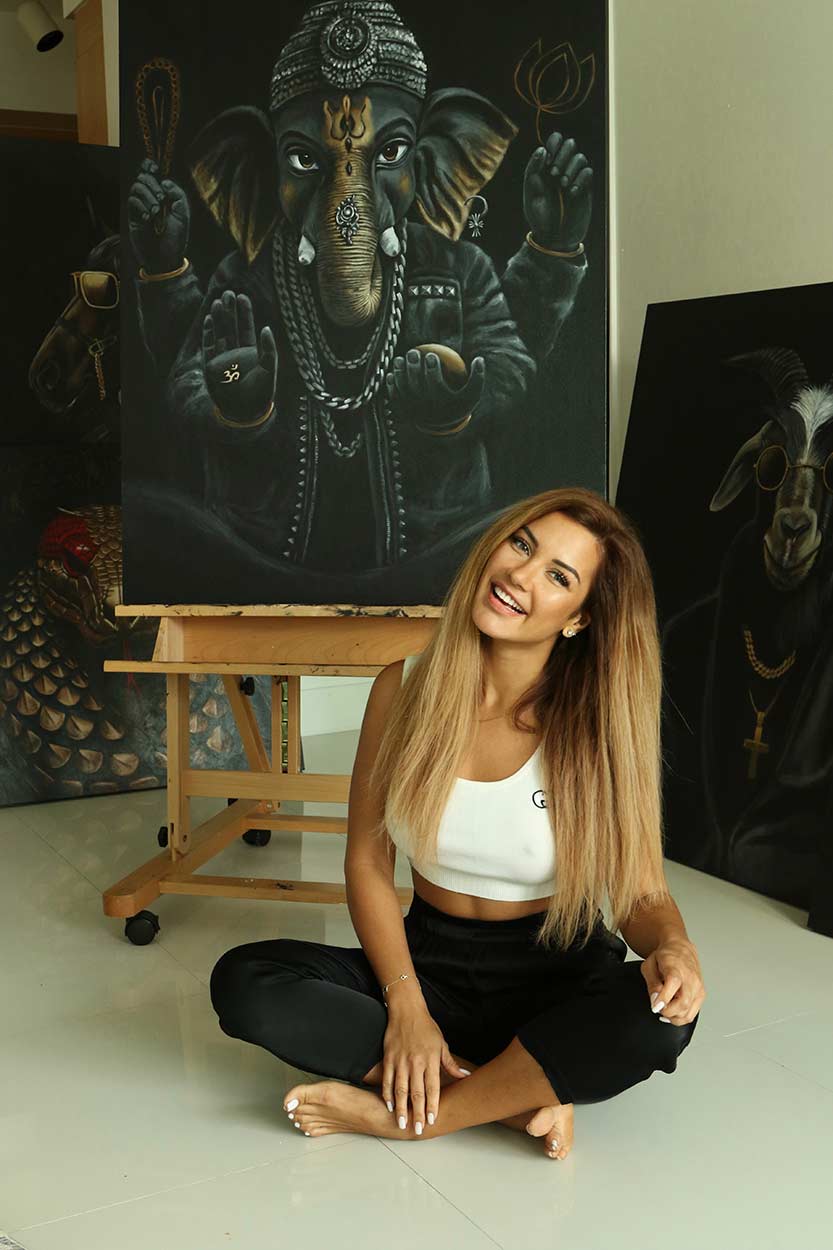 That development became especially visible in the works shown at MORA Art Museum. Bear With the Cigar, and I Got the Power introduced highly stylized figures charged with attitude, projection, and social performance, while Classic Ganesha brought a more still, icon-like presence into the installation. Together, the three paintings showed how Shimova uses symbolism not as decoration, but as a way of thinking through power, vulnerability, ritual, and self-construction.